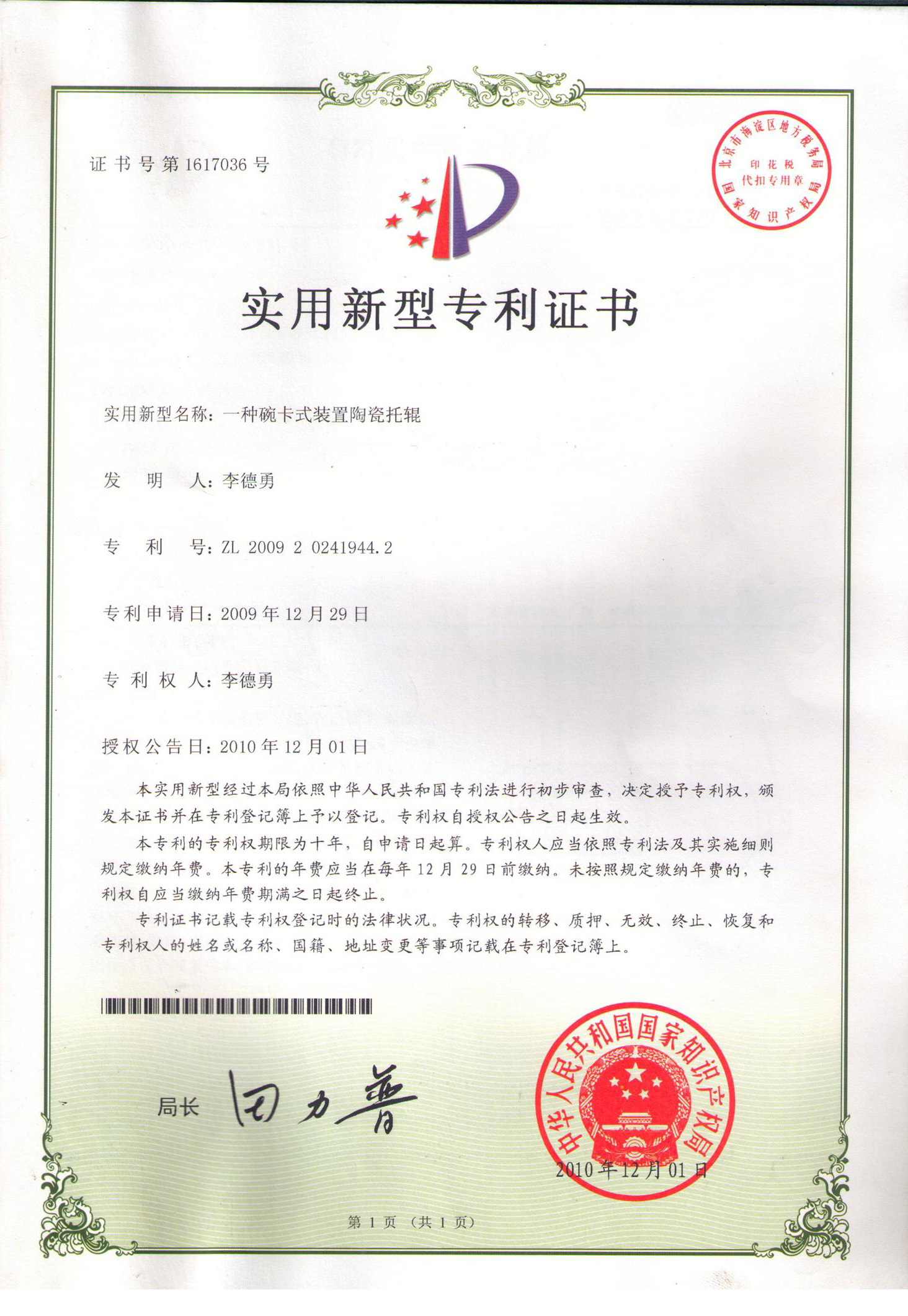 碗卡式耐磨陶瓷托輥專利證書